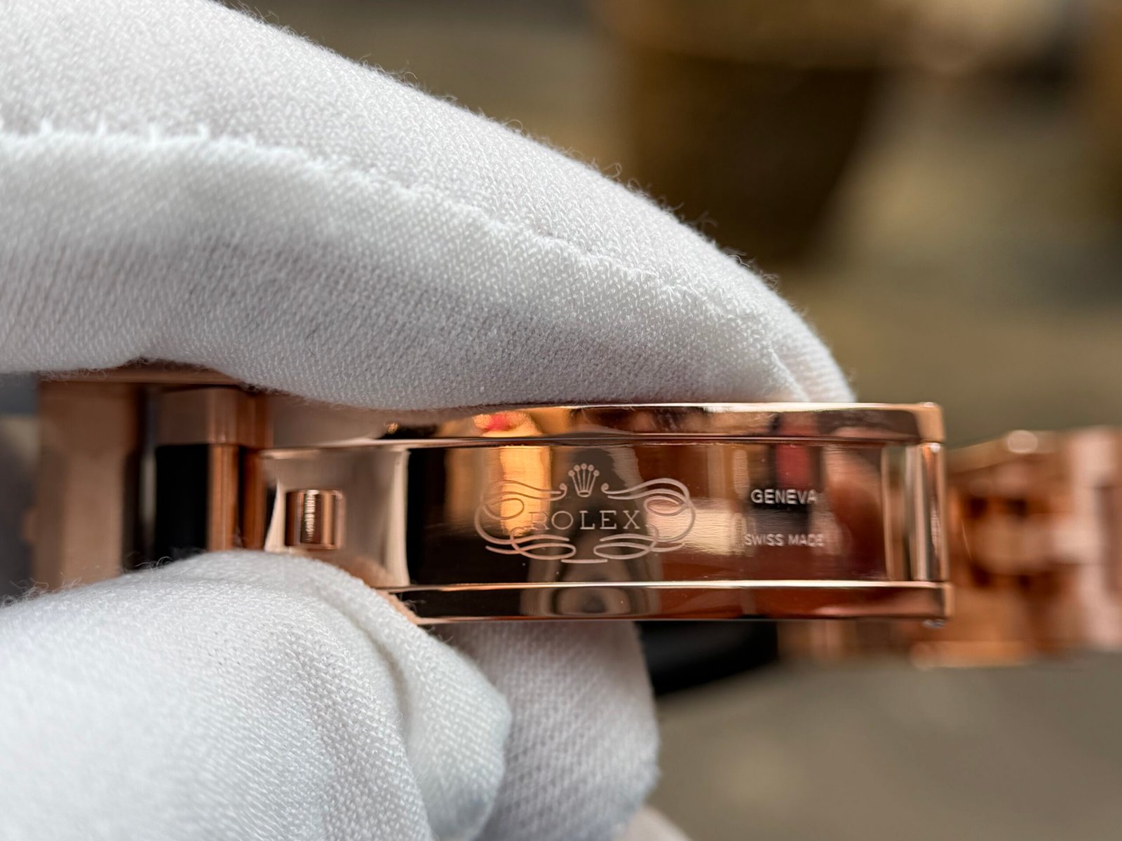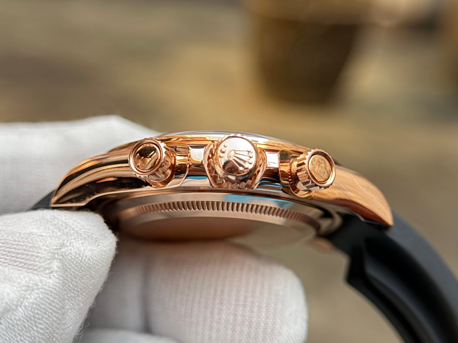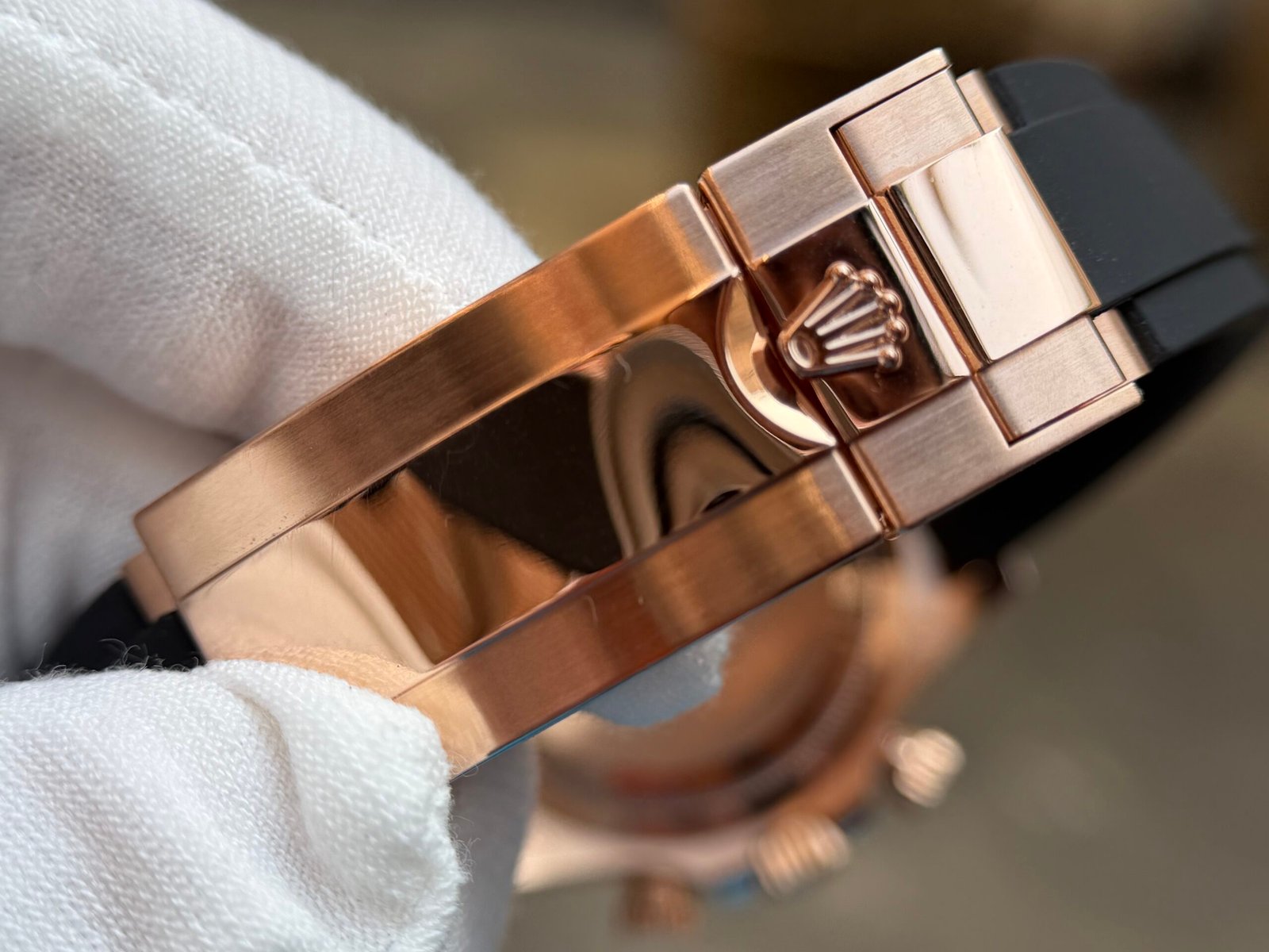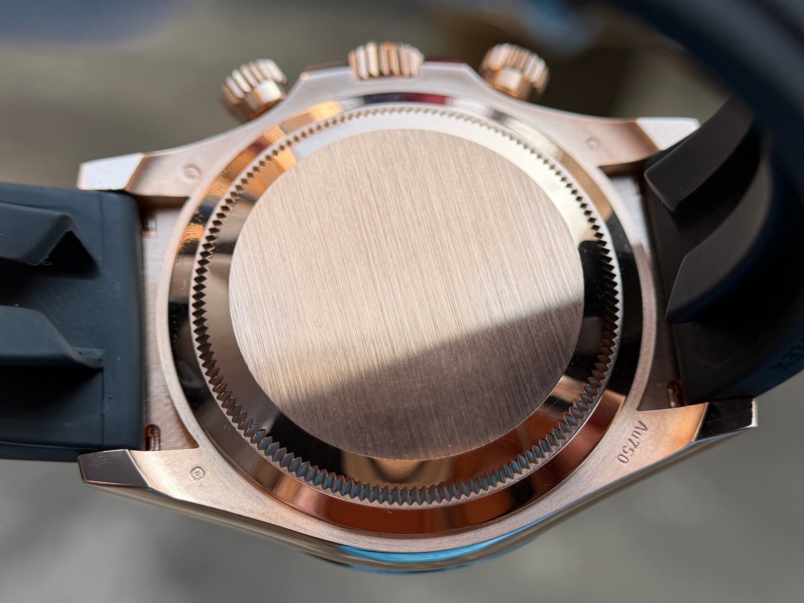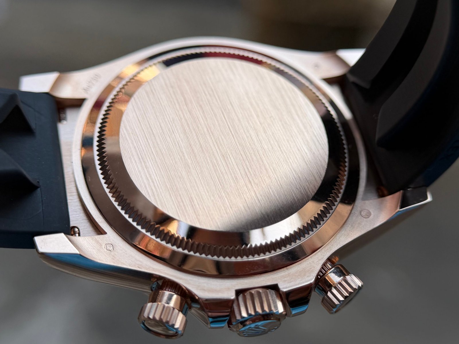 Caseback:screw-down Rose gold back(Wrap 18K Rose Gold 10 microns), screw-down crown and push buttons with Triplock triple waterproofness